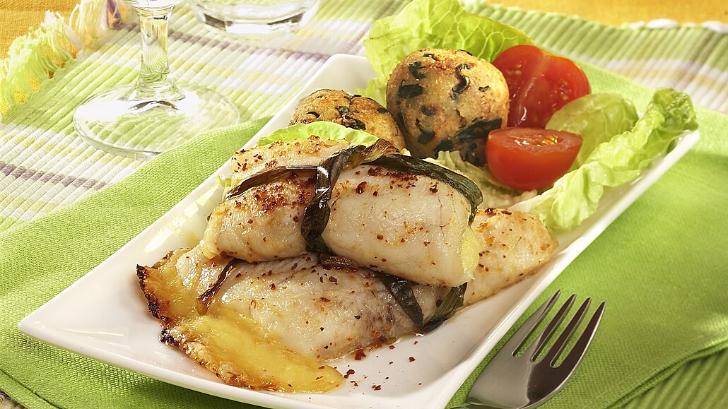 - Do pekáčku dáme polovinu másla s olejem a vložíme rybí balíčky. Položíme na ně zbylé máslo a pokapeme je olejem. Pečme při 200 °C asi 12 minut. Místo ementálu můžeme tresku proložit nivou. Podáváme s vařenými bramborami a zeleninou.