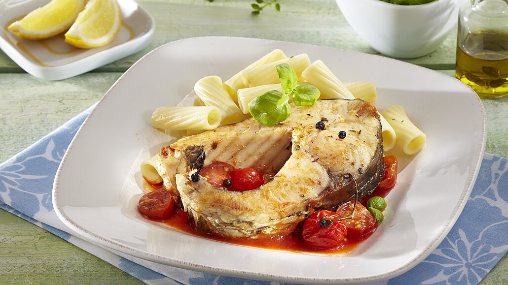- Podkovy upečeného amura spolu s cherry rajčátky vyjmeme a udržujeme v teple. Výpek se zbylou zeleninou propasírujeme. Rybu s rajčátky rozdělíme na talíře a přelijeme připravenou omáčkou. Podáváme s těstovinami.