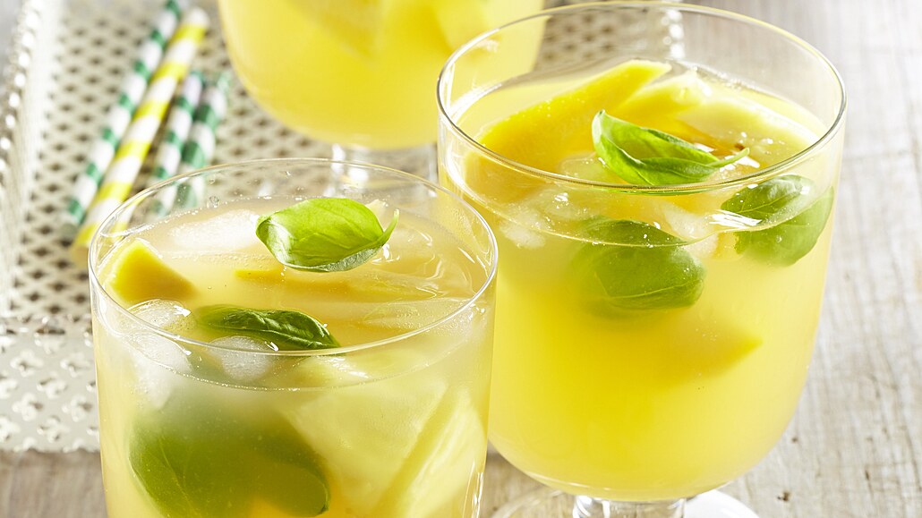 - Do džbánu nebo větší skleněné mísy nalijeme bílé víno a džus. Přidáme ananas, mango a lístky bazalky. Vše promícháme a uložíme vychladit do lednice.
