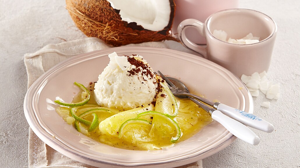 - Vychlazené plátky ananasu rozložíme na talíř, přidáme kopeček kokosové zmrzliny, ozdobíme limetkovou kůrou a posypeme kakaem.