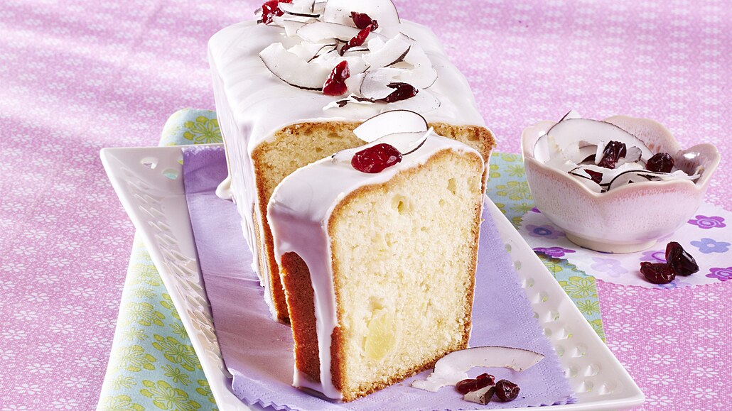 - Vmícháme kokos, prosátou mouku s kypřicím práškem a na kousky nakrájený ananas. Hotové těsto naplníme do chlebíčkové formy vymazané tukem a vysypané moukou.