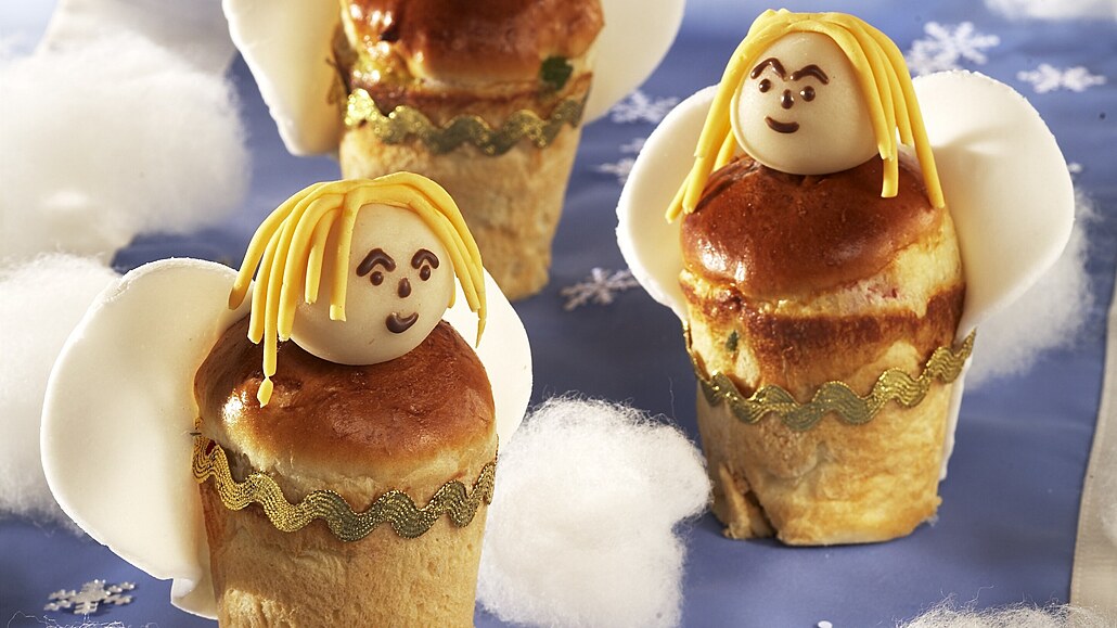 - Marcipánovou hmotu prohněteme. Z poloviny vyválíme kuličky na hlavičky. Z druhé poloviny oddělíme třetinu, obarvíme ji nažluto a protlačíme lisem na česnek. Vlásky mírně navlhčíme a přilepíme na hlavičku. Zbylou marcipánku rozválíme na tenký plát a vykrájíme srdce jako křídla. Na bochánek přilepíme rozpuštěnou polevou křídla i hlavičku a namalujeme obličej.