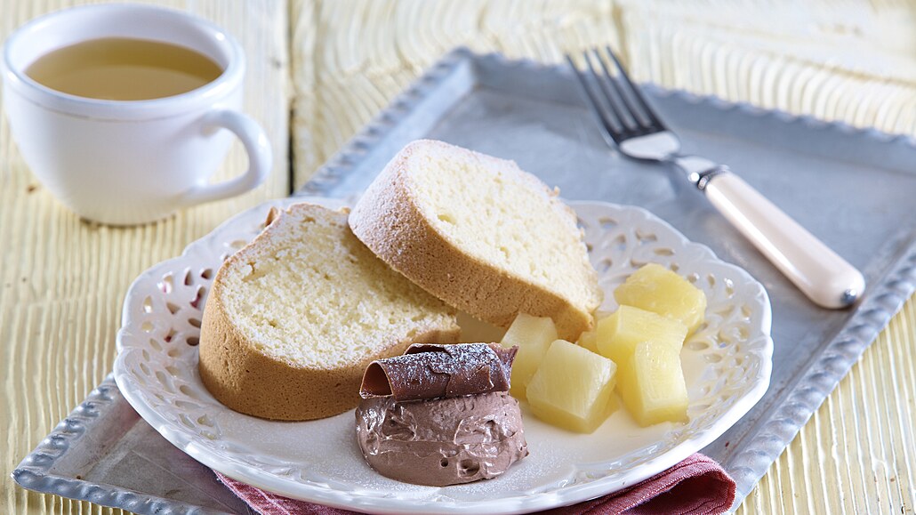 - Bílky lehce vyšleháme, přidáme škrobovou moučku, pak i polovinu cukru a připravíme tuhý sníh. Žloutky utřeme se zbylým cukrem do pěny. Střídavě do ní vmícháme mouku promísenou s kypřicím práškem a špetkou soli, 120 ml vody a aroma. Nakonec těsto opatrně nadlehčíme bílkovým sněhem.