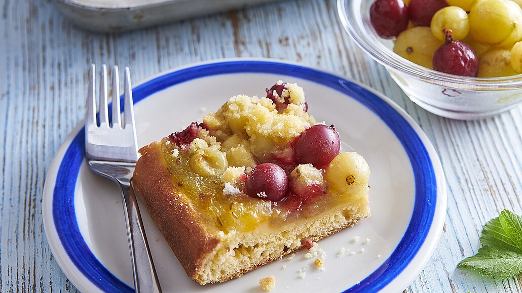 - Pak rozválíme na plát a přendáme na pekáček (asi 30 x 40 cm). Na povrch těsta rozložíme očištěný angrešt. Drobenku připravíme smícháním másla s cukrem a moukou.