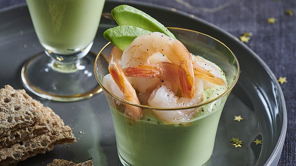 - Krémem naplníme malé pohárky, přidáme osušené krevety a dozdobíme odloženými plátky avokáda. Podáváme například s pečivem nebo krekry.