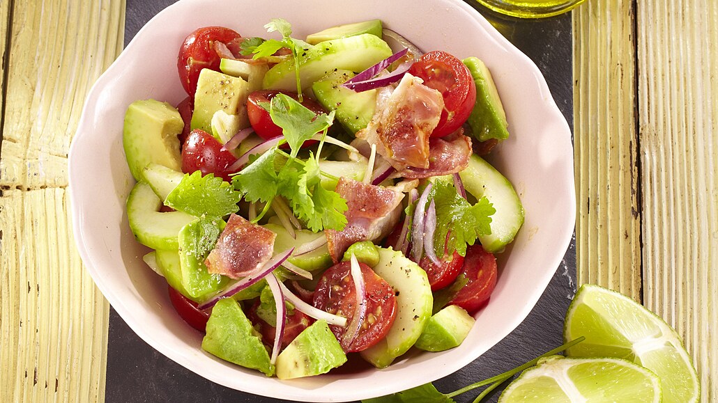 - Avokádo rozpůlíme, vyjmeme pecku a oloupeme ho. Pak jej nakrájíme na kousky a pokapeme šťávou z poloviny limety. Okurku oloupeme a spolu s omytými rajčaty ji nakrájíme na kousky. Cibuli oloupeme, rozpůlíme a nakrájíme na měsíčky