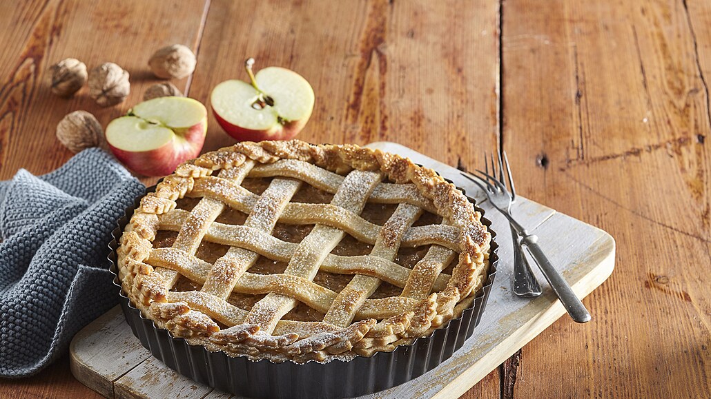 - Z těsta na mřížku vyválíme plát silný asi 3 mm a pomocí rádýlka nakrájíme dlouhé proužky široké 1 cm. Z připravených proužků vytvoříme na povrchu koláče mřížku a ze zbytků těsta vykrájíme lístečky, kterými ozdobíme okraj koláče. Těsto potřeme prošlehaným vejcem, posypeme cukrem a pečeme dozlatova v troubě vyhřáté na 180 °C asi 35 minut.