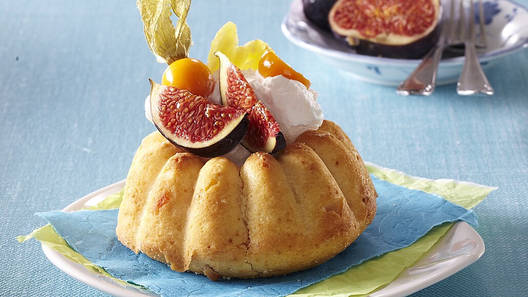 - Po upečení necháme ve formičkách krátce vychladnout a pak vyklopíme na kovovou mřížku. Střed vychladlých báboviček naplníme zakysanou smetanou a ozdobíme fíkem, physalisem a kouskem ananasu.