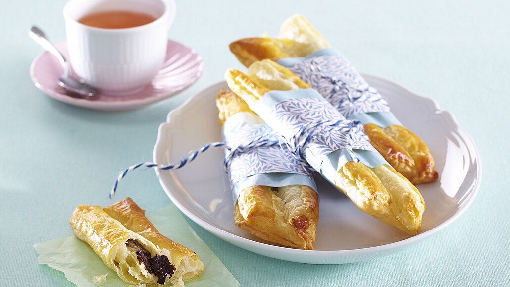 - Čokoládu nakrájíme na drobné kousky. Listové těsto rozválíme na plát silný 3 mm a rozkrájíme na obdélníky 16x12 cm.
