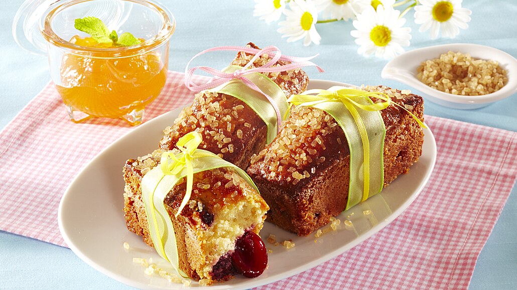 - Karamelky nahrubo nasekáme. Třešně omyjeme, necháme oschnout, vypeckujeme a pokrájíme. Změklé máslo utřeme s cukrem a špetkou soli do pěny, do které postupně zapracujeme vejce a mléko. Pak přimícháme prosátou mouku s práškem do pečiva a nakonec karamelky s třešněmi.