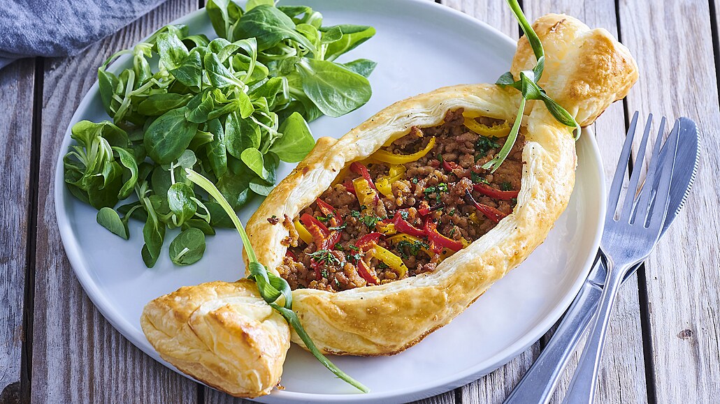 - Listové těsto rozválíme na plát o tloušťce zhruba 3 mm, ostrým nožem nebo rádýlkem ho rozdělíme na 4 stejné obdélníky. Střed obdélníku poklademe masovou náplní, přes kterou přehneme okraje těsta a konce svážeme jarní cibulkou.