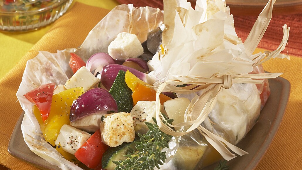 - Z pečicího papíru si vystřihneme čtyři kolečka o průměru asi 20 cm. Do jejich středu rozdělíme grilovanou zeleninu, cibuli a česnek. Směs dochutíme tymiánem, solí, pepřem a zakapeme olivovým olejem. Na kopečky zeleniny přidáme kousky sýru feta.
