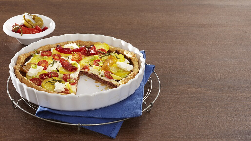 - Listové těsto rozválíme na pomoučněném válu na plát silný asi 2 mm. Vyložíme jím koláčovou formu a vytvoříme zvýšené okraje. Na dně těsto propícháme vidličkou. Rozprostřeme na něj zchladlou masovou směs, kterou pak poklademe pokrájeným balkánským sýrem, plátky brambor, rajčátky, jarní cibulkou a kozími rohy.