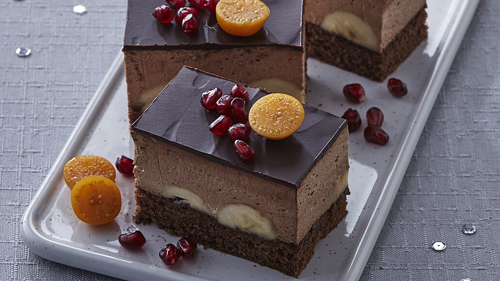 - Banány oloupeme, rozkrojíme vodorovně na poloviny, rozložíme je na povrch korpusu a rozetřeme na ně náplň. Uložíme do ledničky zatuhnout asi na 4 hodiny. Po ztuhnutí povrch potřeme rozpuštěnou čokoládou a necháme znovu ztuhnout. Poté nakrájíme na porce a ozdobíme čerstvým ovocem.