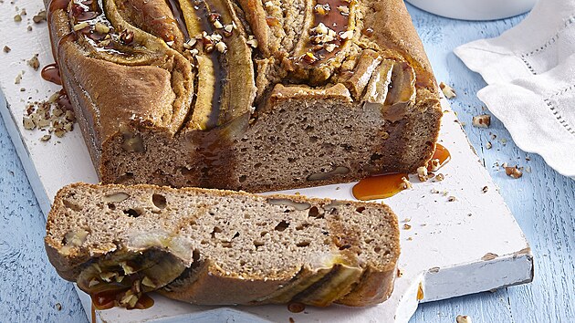 - Suché suroviny poté zapracujeme do vaječné směsi. Přidáme nahrubo nasekané ořechy. Těsto nalijeme do formy (15x20 cm), uhladíme, poklademe přepůlenými zbylými banány a pečeme při 170 °C asi 50 minut.