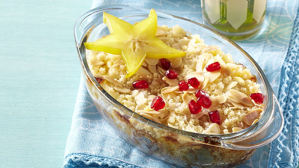 - Z másla, cukru a mouky vypracujeme drobenku, kterou zakryjeme ovocnou směs. Nakonec povrch posypeme mandlovými lupínky. Vložíme do vyhřáté trouby a při 180 °C zapékáme asi 30 minut. Po upečení necháme mírně vychladnout, ozdobíme plátky karambol a zbylými granátovými jadérky. Podáváme teplé.
