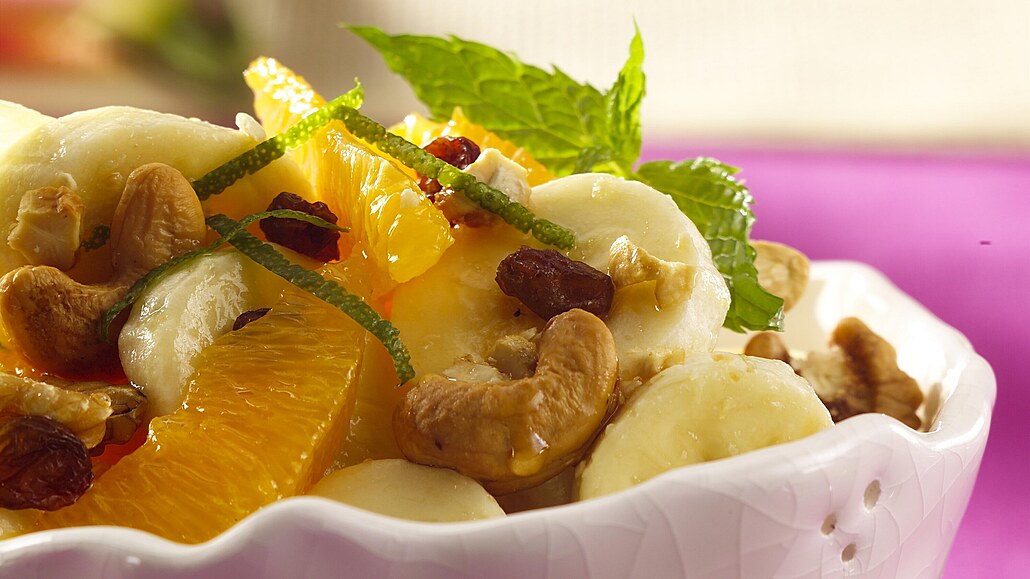 - Banány oloupeme a nakrájíme na plátky a dáme do mísy, přidáme nakrájený a oloupaný pomeranč, rozinky, kešu oříšky a půlky vlašských ořechů.