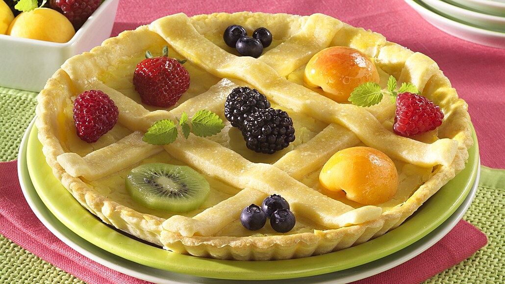 - Koláč vložíme do vyhřáté trouby a pečeme při 200°C asi 35 - 40 minut. Na upečený koláč rozložíme čerstvé nebo kompotované ovoce. Do každého políčka dáme střídavě jiný druh -maliny, meruňky, kiwi, jahody, ostružiny, borůvky. Potřeme ho tenkou vrstvou želatiny, připravené podle návodu na sáčku a necháme zatuhnout.