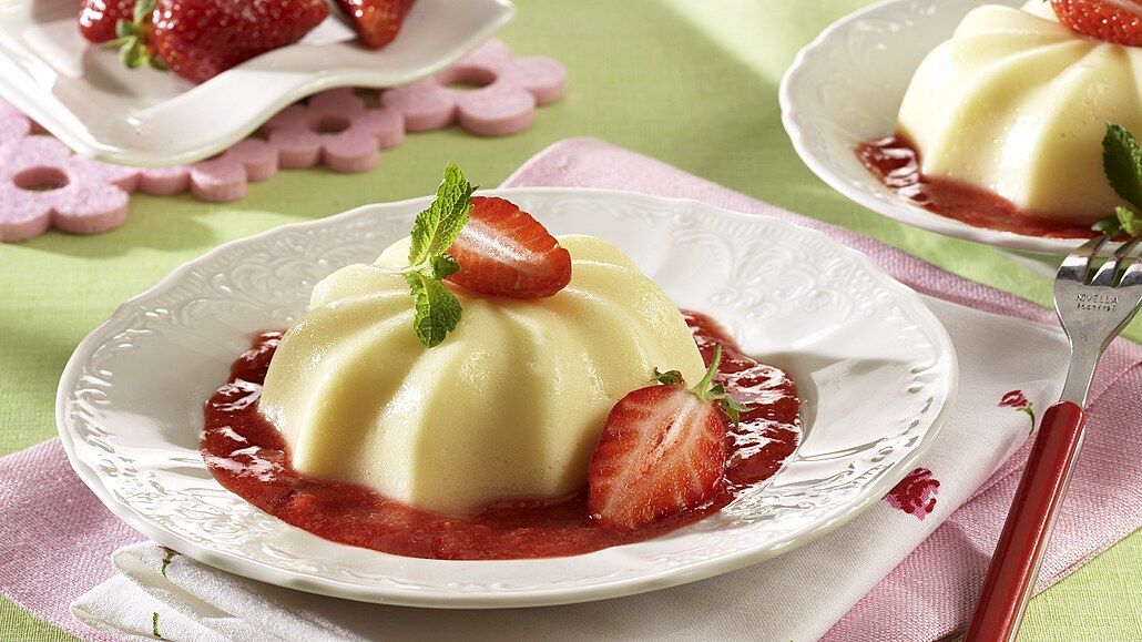 - Jahody očistíme, nakrájíme na malé kousky a rozmixujeme je s cukrem a citronovou šťávou (několik jahod necháme vcelku na dozdobení dezertu). Omáčku propasírujeme přes hustý cedník. Vychladlý krém vyklopíme na talířky, doplníme omáčkou a ozdobíme jahodami.