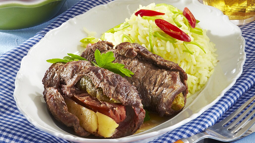 Poctivý masitý pokrm z jednoho hrnce kombinuje křehké hovězí maso s náplní z párku, okurky a brambor. Omáčka z černého piva, zahuštěná pivo-moučnou směsí, dodává závitkům tu pravou bavorskou hloubku, která se nejlépe snoubí s porcí dušené rýže.