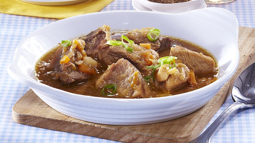 - Maso osolíme, okmínujeme a podlijeme pivem. Přiklopíme a dusíme doměkka. Během dušení podléváme podle potřeby vodou. Ke konci dušení zahustíme nastrouhaným chlebem a provaříme. Hotové maso podáváme s čerstvým pečivem.