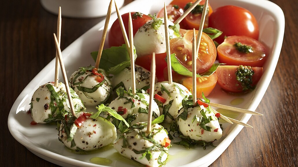 - Z mozzarely slijeme vodu. Kuličky obalíme v ochucené bazalce a napícháme do nich párátka.