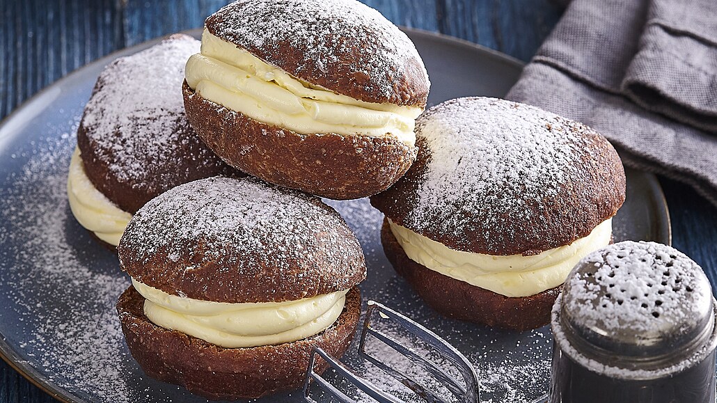 - Z mléka, cukru a prášku uvaříme krém, mícháme dokud nevychladne a pak rozšleháme dohladka. Smetanu vyšleháme se ztužovačem a zlehka spojíme s krémem. Koblihy rozkrojíme a naplníme.