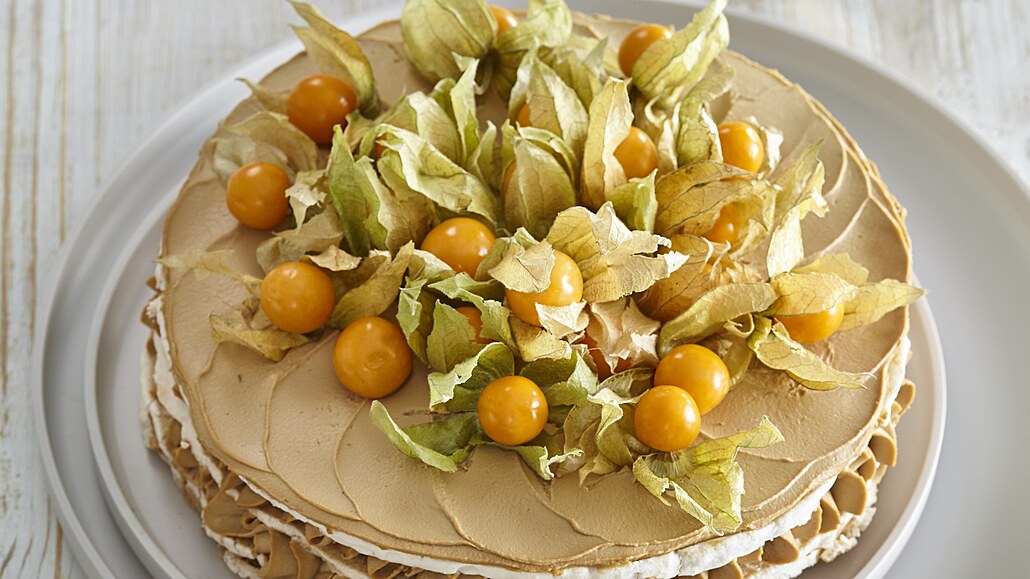 - Pomocí cukrářského sáčku naneseme krém na jednotlivé pláty a vyskládáme je na sebe. Zakončíme vrstvou krému, kterou ozdobíme physalisem. Dáme na 2 hodiny vychladit do lednice.