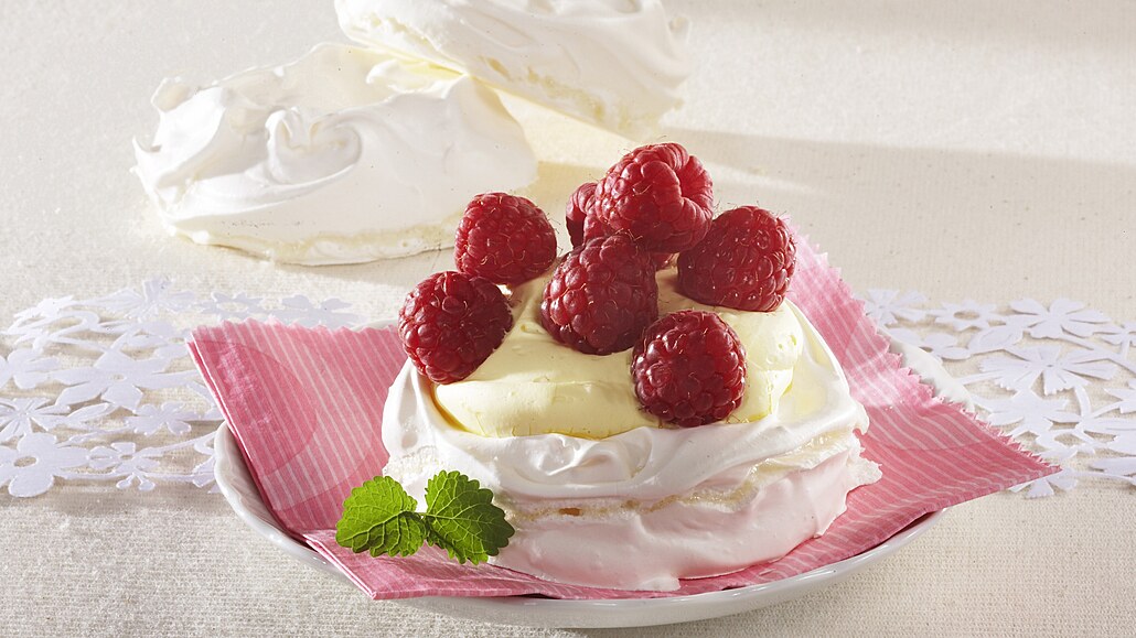 - Smetanu vyšleháme s vanilkovým cukrem na pevnou šlehačku a zlehka ji promícháme s pudinkovým krémem. Krém naplníme do cukrářského sáčku s hladkou trubičkou a nastříkáme na povrch dortíčků. Nakonec ozdobíme malinami.