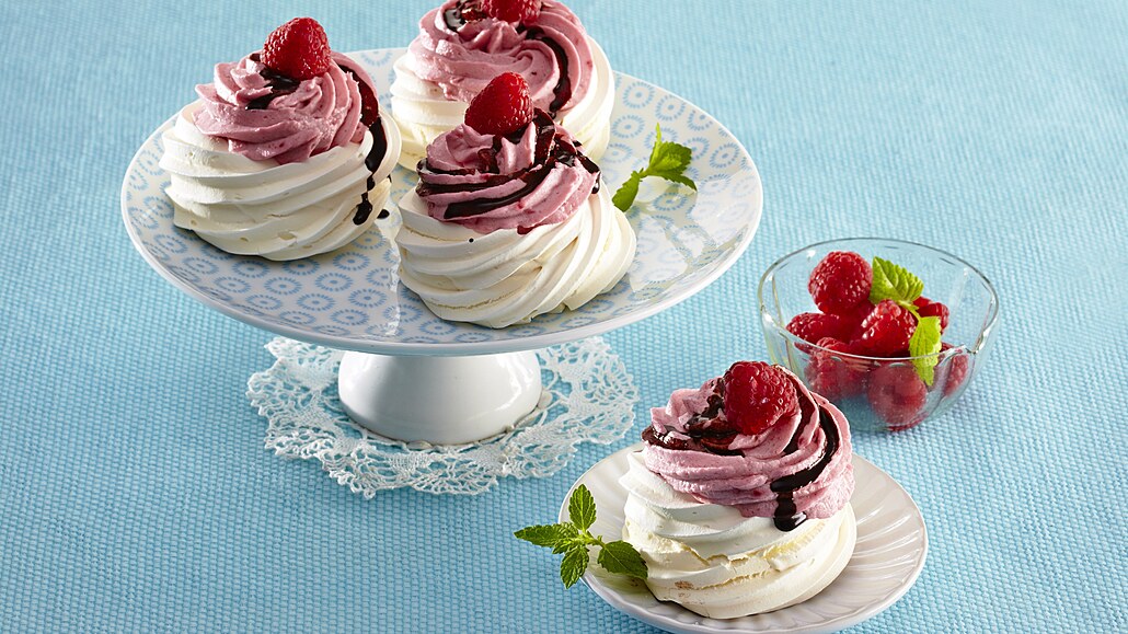 - Malinovou pěnu naplníme do cukrářského sáčku s řezanou špičkou a nastříkáme do vychladlých košíčků. Nakonec je ozdobíme zbylými malinami a polijeme rozpuštěnou čokoládou.