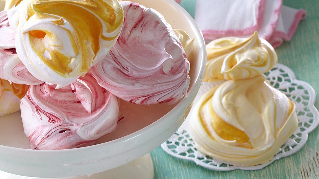 - Sníh rozdělíme na poloviny. Do jedné lehce promícháme jahodový sirup a do druhé meruňkový. Lžící rozetřeme na plechy vyložené pečicím papírem pusinky.
