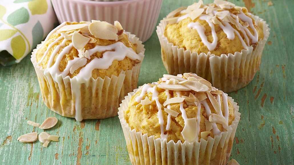 - Vychladlé muffiny přestříkáme bílou čokoládovou polevou a posypeme plátky mandlí.