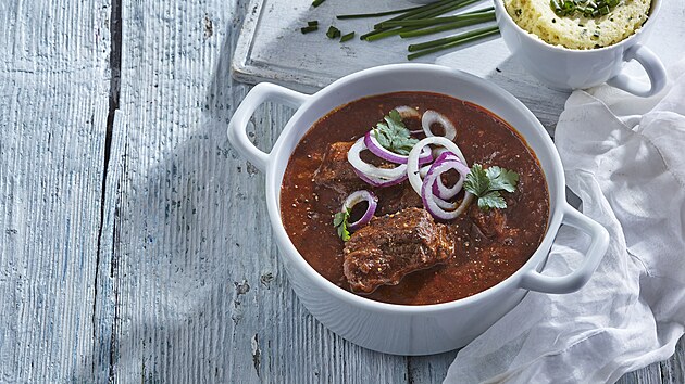 - V misce smícháme jogurt, mandlovou mouku, vejce, pažitku, sůl a prášek do pečiva. Vše důkladně promícháme a směs nalijeme do máslem vymazaných hrnků, které vložíme asi na 3-5 minut do mikrovlnné trouby. Guláš podáváme spolu s knedlíky, posypaný nakrájenou cibulí a petrželkou.