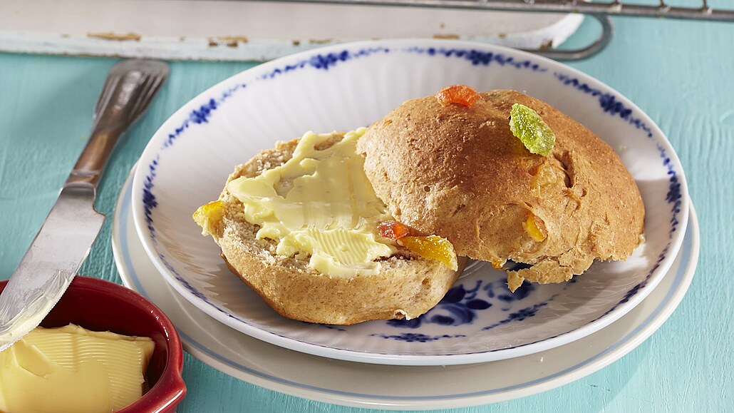 - Do těsta zapracujeme rozinky a kandovanou kůru. Těsto necháme vykynout ještě jednou. Pak ho rozdělíme asi na 12 kousků a z každého vytvarujeme bochánek.