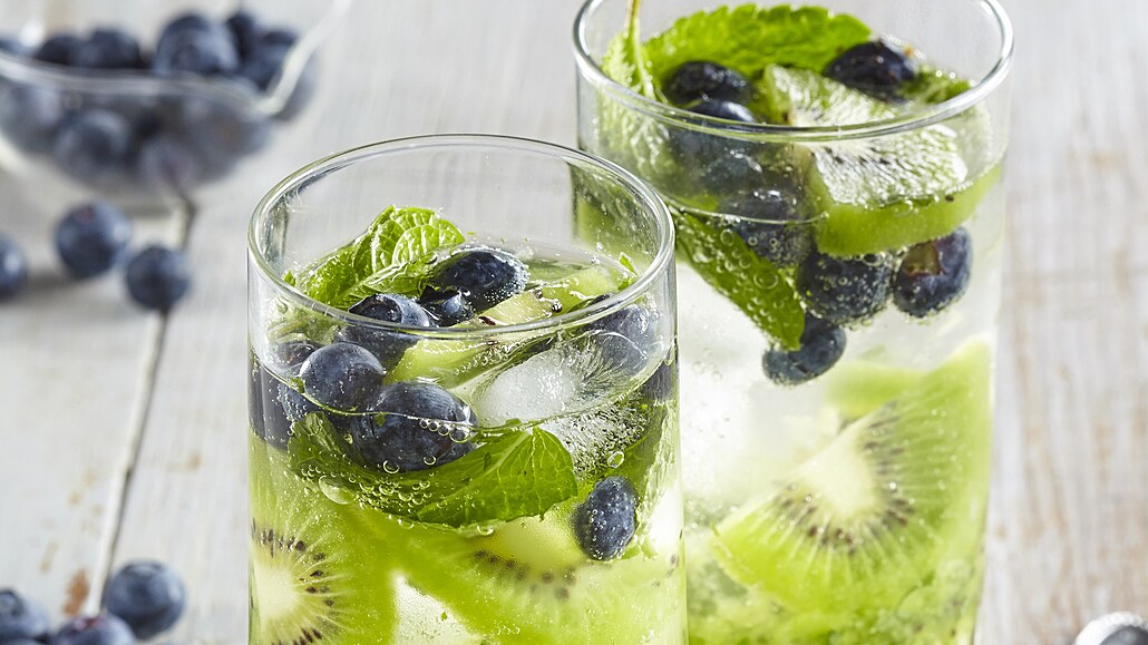 - Do sklenic rozdělíme polovinu borůvek, přidáme rumové pyré z kiwi a trochu ledu. Zalijeme perlivou vodou. Nakonec sklenice ozdobíme plátky kiwi, zbylými borůvkami a mátou.