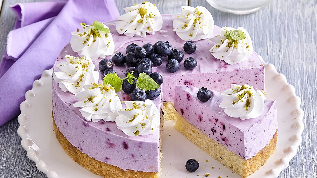 - Ztuhlý dort uvolníme po jeho obvodu pomocí nože z formy a formu sejmeme. Smetanu vyšleháme s vanilkovým cukrem na pevnou šlehačku. Naplníme jí cukrářský sáček s řeznou trubičkou a obvod dortu ozdobíme pusinkami. Posypeme je pistáciemi. Nakonec střed dortu dozdobíme borůvkami.