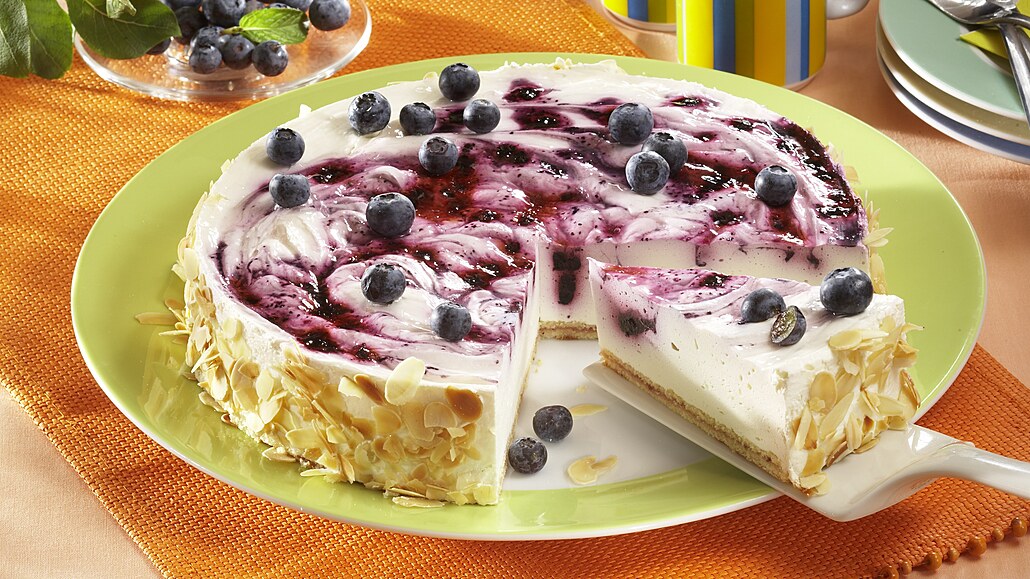 - Korpus vložíme na dno rozevírací dortové formy a navrstvíme na něj všechnu šlehačku. Povrch uhladíme a lžící na něj naneseme borůvkovou kaši. Hotový dort necháme vychladit. Pak jej vyndáme z formy, po obvodu obalíme v pražených madlích a rozkrájíme.