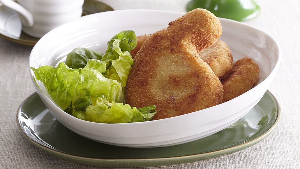 - Z těsta vytvarujeme 4 placky ve tvaru větších kotlet. Obalíme je postupně v mouce, rozšlehaném vejci s mlékem a strouhance.