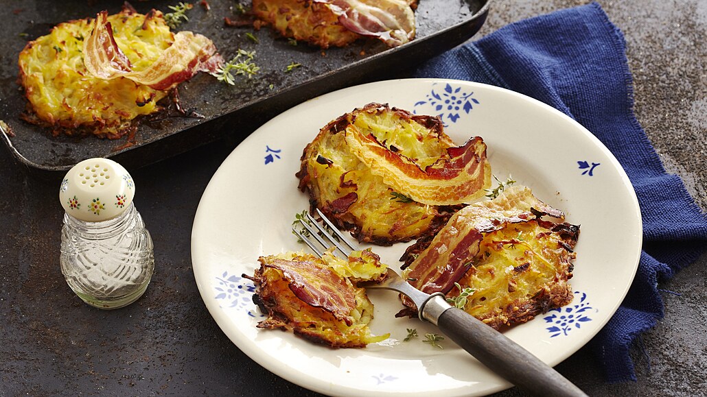 - Na vymazaný plech tvoříme z bramborové směsi lžící stejně velké placičky. Vložíme do trouby vyhřáté na 200 °C a pečeme 15-20 minut, až budou na povrchu lehce zlatavé. Pak na placičky rozložíme plátky slaniny a pečeme ještě 5 minut, až bude slanina křupavá.