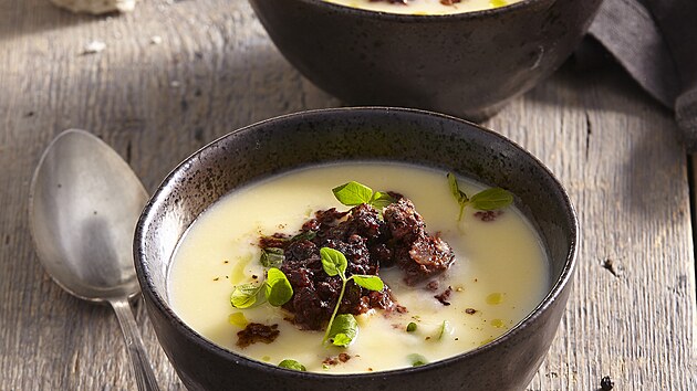 Když se spojí brambory s celerem do hladkého krému a navrch přijde voňavé jelítko, vznikne poctivá polévka ideální na chladné dny.