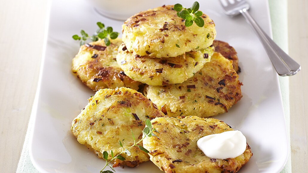 - Z bramborové hmoty vytvoříme malé placičky a na rozehřátém másle na pánvi je opečeme dozlatova. Podáváme je se salátem a ochucenou zakysanou smetanou a zdobíme bylinkami.