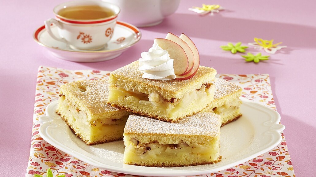 - Hotovou náplň rozložíme na těsto v pekáčku a na povrch položíme druhý díl těsta. Okraje k sobě dobře přitiskneme. Pečeme ve vyhřáté troubě při 175 °C asi 45 minut. Po upečení necháme vychladnout v pekáčku a pak nakrájíme. Nakonec ozdobíme vyšlehanou šlehačkou a jablíčkem.
