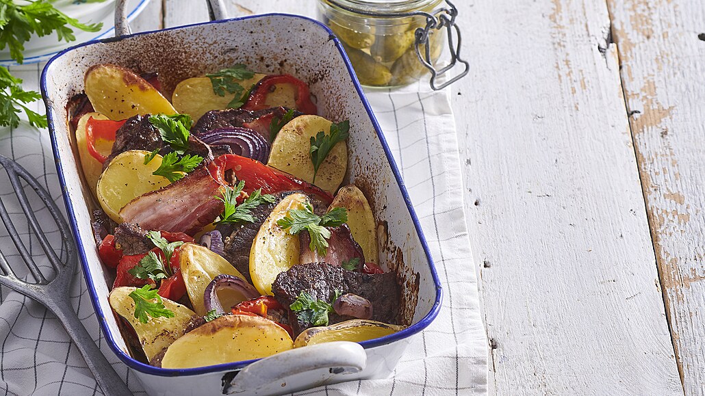- Nakonec přidáme zbylé maso, zeleninu a brambory se slaninou. Osolíme, opepříme a pečeme při 200 °C asi 20 minut, podlijeme vínem a teplotu snížíme na 160 °C. Vše zakryjeme alobalem a pečeme cca 90 minut. Podáváme posypané petrželkou spolu s nakládanými okurkami.