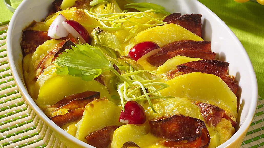 - Zapékací misku vymažeme máslem. Na zbylém másle orestujeme nakrájený salám společně s pórkem. Na dno vymazané misky rozložíme plátky brambor a posypeme je směsí salámu s pórkem. Znovu dáme vrstvu brambor, salámovou směs a střídavě naplníme celou misku. Poslední vrstvu by měly tvořit brambory. Vložíme do vyhřáté trouby a pečeme asi deset minut.