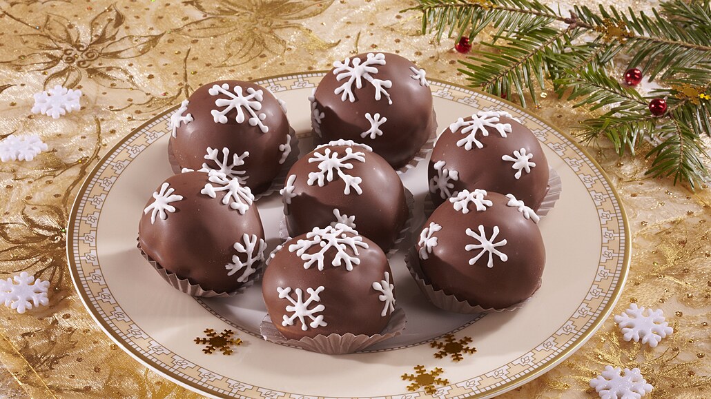 - Hotovým krémem plníme piškotky a slepujeme vždy dva k sobě. Marcipánku rozválíme na tenký plát. Rozkrájíme ho na čtverce a do každého zabalíme slepené piškoty. Dáme ztuhnout do chladničky. Po zatuhnutí celé namáčíme v rozehřáté čokoládové polevě. Povrch ozdobně přestříkáme bílou polevou nebo jí namalujeme malé vločky.