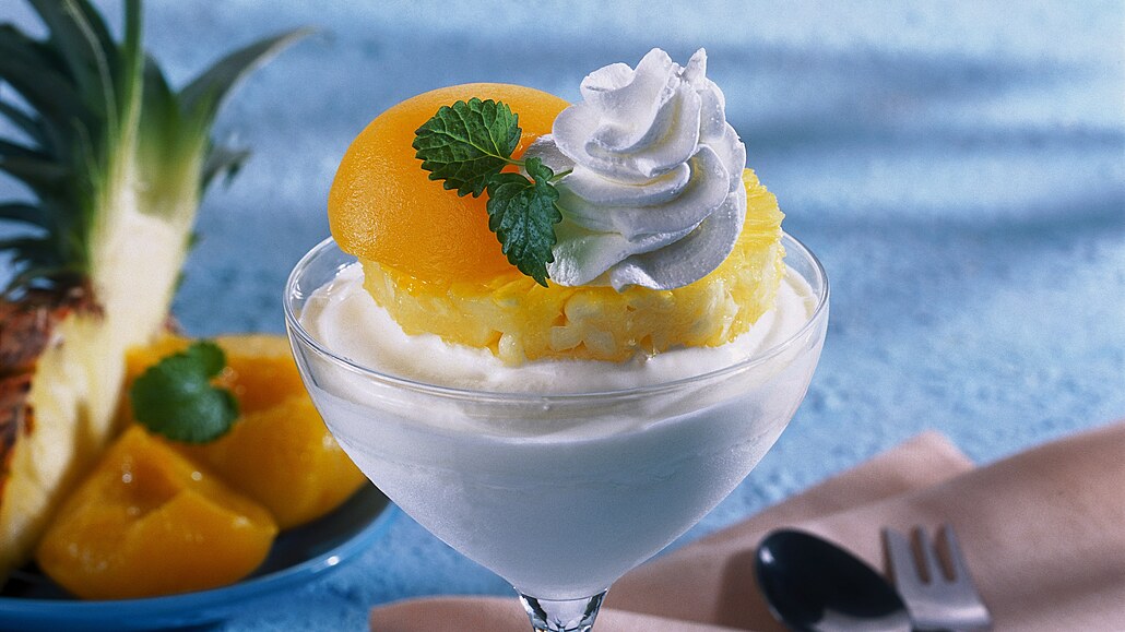 - Zmrzlinu rozdělíme do čtyř pohárů, povrch uhladíme a položíme na něj připravený ananas. Na kolečko ananasu dáme půlky broskví vyklenutou částí nahoru. Dobře ušleháme smetanu s cukrem a poháry ozdobíme. Podáváme vychlazené.