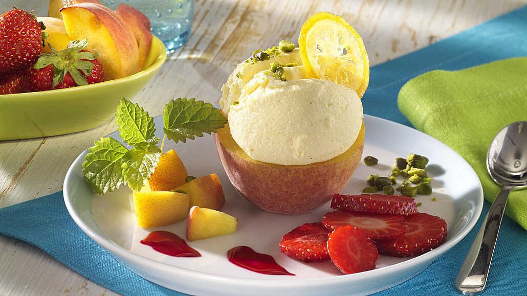 - Broskve omyjeme, rozkrojíme na polovinu a vyjmeme z nich pecku. Na každou půlku naneseme kopeček zmrzliny. Broskve dozdobíme zkaramelizovaným plátkem citronu a nasekanými pistáciemi.
