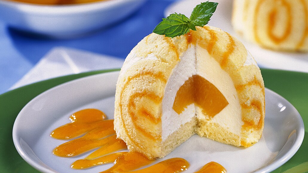 - Na upečený plát dáme utěrku, plech překlopíme. Pečicí papír, který je nyní navrchu, pokapeme trochou vody a opatrně ho sloupneme. Plát potřeme meruňkovým džemem a pomocí utěrky pomalu zavineme. Vychladlou roládu nakrájíme na 1 cm silné plátky a jimi vyložíme malé půlkulaté formičky (pokud je nemáme, můžeme použít mističky).