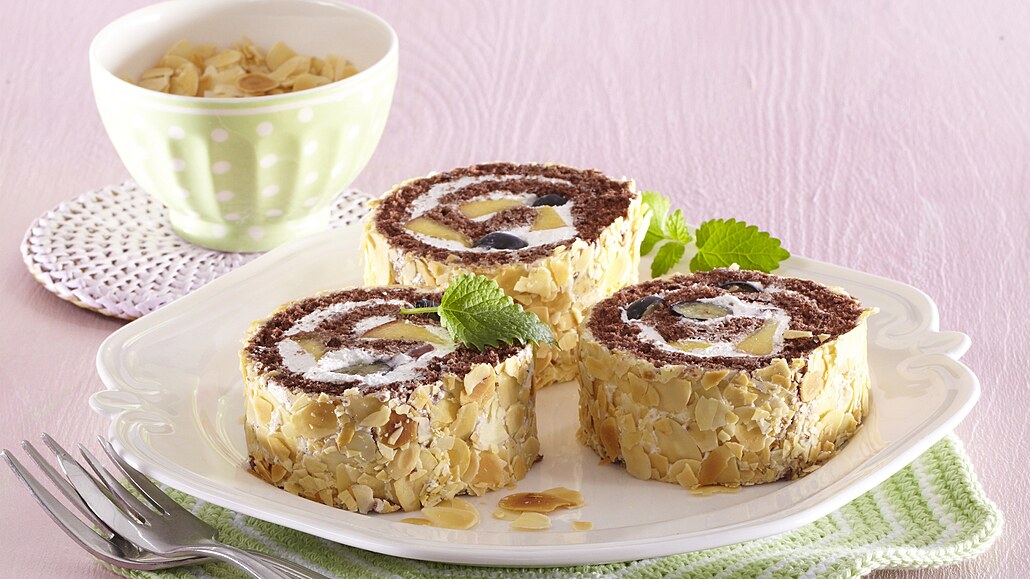 - Roládu potřeme zbylou šlehačkou a obalíme do pražených mandlových lupínků. Uložíme ji do chladničky ztuhnout a pak nakrájíme.
