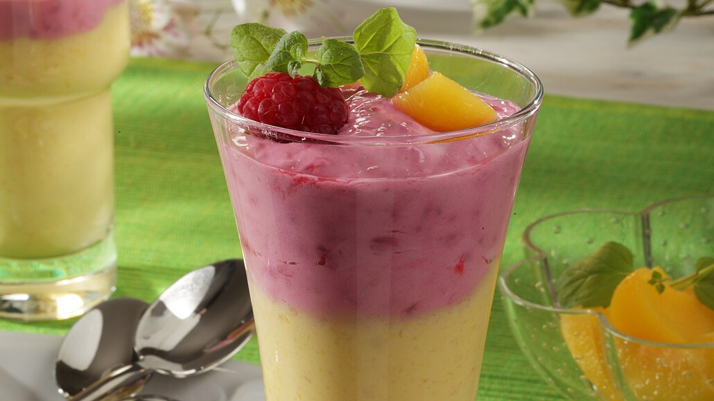 - Vychlazené broskve rozmixujeme s 350 g jogurtu a 100 ml mléka. Nápoj rozdělíme do skleniček. Stejným způsobem připravíme malinovou vrstvu. Nápoj dozdobíme a ihned podáváme.